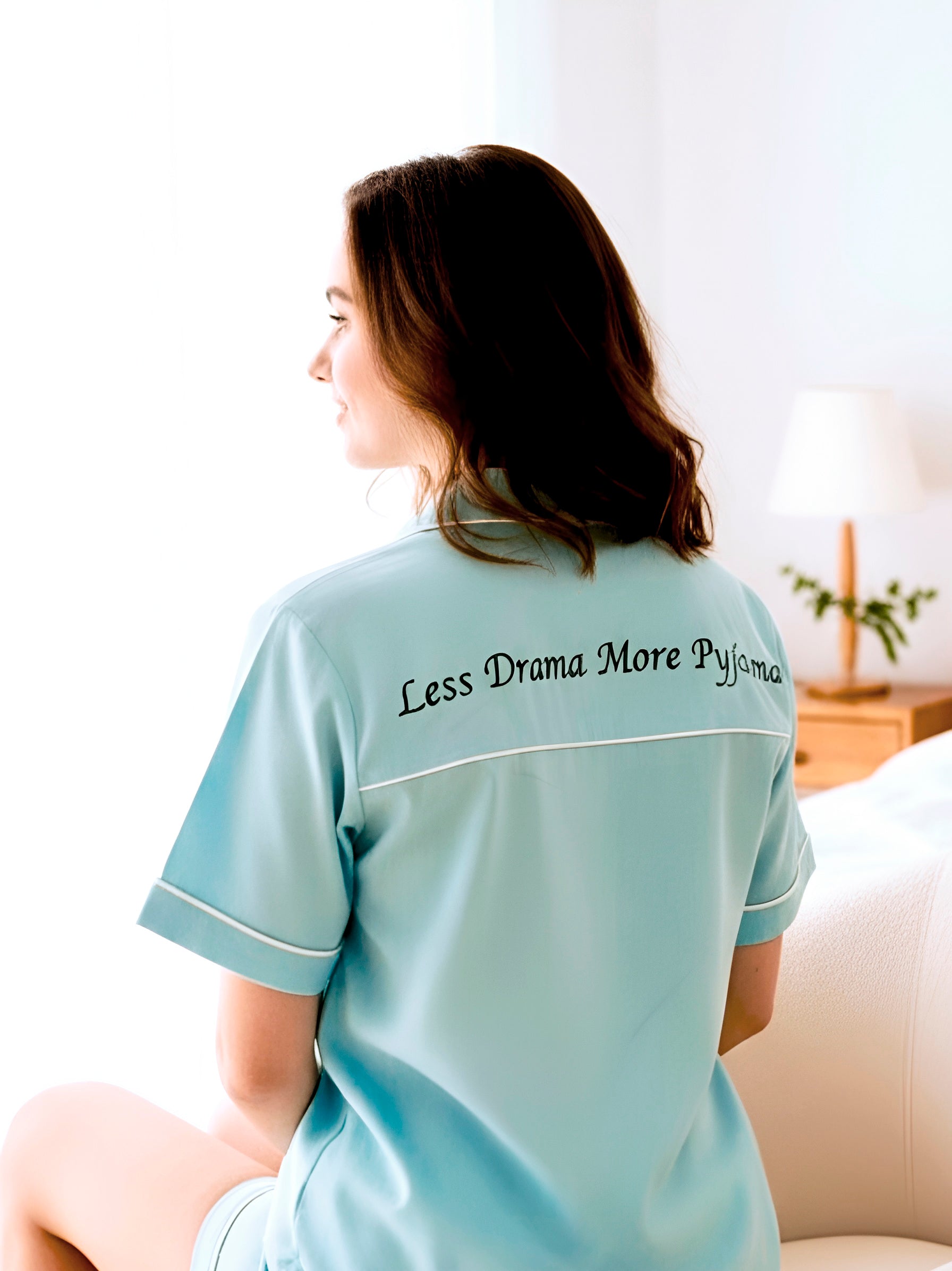 Conta ainda com bordado frontal e traseiro, incluindo a frase “Less Drama, More Pyjama”, que adiciona um toque leve, moderno e com personalidade: um convite direto ao descanso.